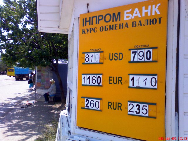 Евпатория 2009Отдых в Крыму. Курс обмена валют на 8-9-10 августа 2009 года. Украина. Киев. Национальный банк Украины (НБУ) установил на 8 – 10 августа 2009 года следующий официальный курс гривны по отношению к иностранным валютам. 100 долларов США = 770.3800 гривны. 100 евро = 1106.0346 гривны. 10 рублей России = 2.4420 гривны. А теперь официальный текст на украинском языке. Офіційний курс гривні щодо іноземних валют 10.08.2009. Детальніше: 100 доларів США =  770.3800.  100 євро = 1106.0346. 10  рублів Росії = 2.4420.  8 августа «Крымский  аналитик» провел очередной фото мониторинг курса обмена наличной валюты в Евпатории и в Крыму.  100 долларов США в пунктах обмена валют Евпатории 8 августа 2009 года у туристов покупали по 790 – 800 гривен, а продавали эту же сотню баксов клиентам банков по 810 – 820 гривен. 1000 рублей России в киосках по обмену валют покупали у туристов из России по 230-235 гривен. Продавали рубли России жителям Крыма и Украины в пунктах обмена валют по 258 – 270 гривен за одну тысячу рублей. Подробнее о курсе обмена Евро, долларов США, и рубля России в Крыму и на Украине смотрите на прилагаемых фото.
