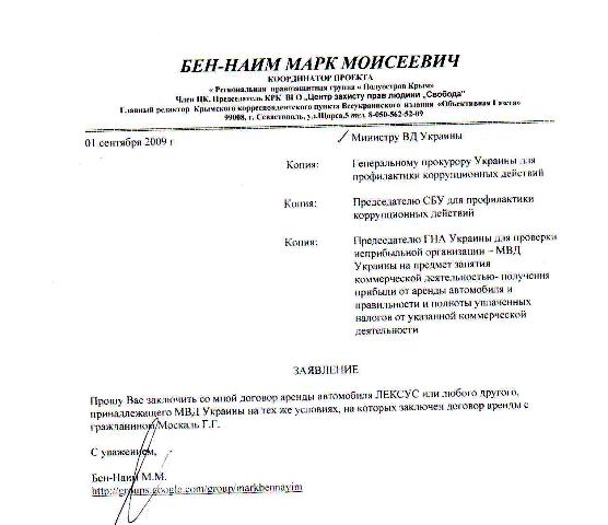 Новый вид услуг от МВД Украины. Министр внутренних дел Украины Юрий Луценко сдает в аренду иномарки. ПРАВОЗАЩИТНИК МАРК БЕН-НАИМ ХОЧЕТ АРЕНДОВАТЬ АВТОМОБИЛЬ МВД УКРАИНЫ НА ТЕХ ЖЕ УСЛОВИЯХ, ЧТО И ГЕНЕРАЛ-ОБЩЕСТВЕННИК ГЕННАДИЙ МОСКАЛЬ.  Сегодня известный крымский правозащитник Марк Бен-Наим направил министру Внутренних Дел Украины Юрию Луценко заявление, в котором просит сдать ему в аренду автомобиль Лексус, такой же, каким пользуется для поездок по Крыму генерал-общественник Геннадий Москаль. Одновременно с заявлением Марк Бен-Наим направил информационный запрос с требованием предоставить ему копию договора аренды имущества МВД Украины - автомобиля Лексус, заключенного между неприбыльной организацией - МВД Украины и гражданином Москаль Г.Г. По мнению правозащитника, данный договор не может быть секретным и его обязаны предоставить по запросу гражданина. Отнесение документов к секретным производят исключительно специальные эксперты по вопросам государственной тайны. Список таких документов обязательно должен быть обнародован в официальном издании СБУ - «Вестнике СБУ». Так же государственная структура не может отказать гражданину в предоставлении тех же благ, которые предоставлены другому гражданину. В данном случае отказ в оформлении договора аренды автомобиля, на тех же условиях, что и для генерала Геннадия Москаля, может быть расценен как коррупционные действия.