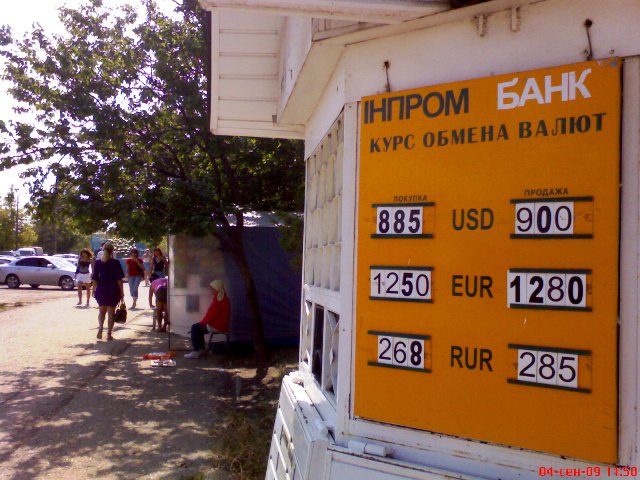 Крымский папарацци провел фото мониторинг курса обмена валют в Крыму. 100 долларов США продавали населению в пунктах обмена валют и филиалах коммерческих банков по 895 - 910 гривен. А покупали эту же сотню долларов США у туристов из России и республики Беларусь в Евпатории по 870-885 гривен. Подробнее о курсе обмена наличной валюты в Крыму, и в Евпатории смотрите на прилагаемых фото. Фото Марка Агатова