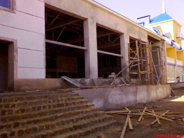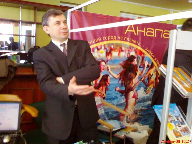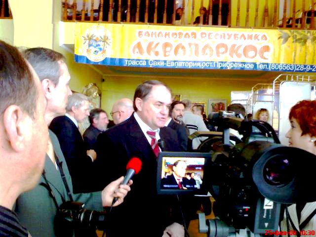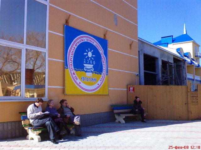 Раньше на этом месте располагалась районная газовая котельная евпаторийского терсовета по управлению курортами профсоюза. Потом ее закрыли, посчитав нерентабельной, и стали возводить фешенебельный пансионат.  Наша экскурсия, как вы уже, наверное, догадались, совершенно случайно совпала с открытием международной ярмарки «Новое лицо древнего курорта».  Здесь можно было приобрести путевки в евпаторийские здравницы, заключить договора и найти поставщиков продуктов, вина и постельного белья. Но это для Вас, господа иммигранты, не главное. А самым важным, я думаю, были слова городского головы Евпатории Андрея Даниленко о том, что, во-первых, курортный сезон в Евпатории состоится при любой погоде, и мазутно – бензиновое пятно с острова Тузла до Евпатории не доберется, потому что нет таких течений в Черном море, которые могли бы занести эту грязь в Каламитский залив. И во–вторых, цены на путевки и еду в Евпатории будут божескими, и тем, кто захочет, сможет здесь оттянуться по полной программе.  Здесь же любители сувениров могли приобрести нечто необычное, изготовленное народными умельцами – золотошвейками.  Нырнуть в бассейн. Правда, при мне ни один морж на подобное не решился. И осмотреть еще одну гостиницу на противоположной стороне улицы и строящиеся торговые ряды. В отличие от улицы Фрунзе здесь нет и не будет палаток по продаже всякой ерунды и навязчивых торговцев, желающих за лето срубить столько «капусты» с дорогих гостей, чтоб ее хватило до следующего сезона.  В завершение нашей экскурсии по улице Шевченко в Евпатории я спросил главного редактора журнала «Терра Таврика» Вячеслава Хачатуряна, не собирается ли и он вслед за многими общими знакомыми иммигрировать куда–нибудь подальше. Слава ничего не ответил, но всем своим видом продемонстрировал такое, что я понял без всяких слов, - зачем ему что-то искать за бугром, когда у него и здесь ЖИЗНЬ УДАЛАСЬ.  На этой оптимистичной ноте я заканчиваю нашу четвертую экскурсию «Евпатория. Ностальгия – 4». 15 июля 2008 года в Евпатории прошел День курортника. Специально для тех, кто там не был фоторепортаж о том, как "Комсомольская правда" проспонсировала стриптиз на главной площади Евпатории". Текст и фото Марка Агатова, При перепечатке ссылка на сайт www.agatov.com ОБЯЗАТЕЛЬНА