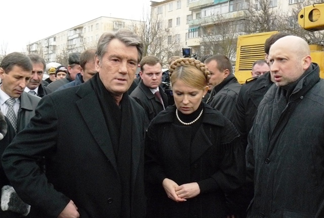 На фото: Юлия Тимошенко и Виктор Ющенко осматривают взорванный дом в Евпатории Фото Марка Агатова