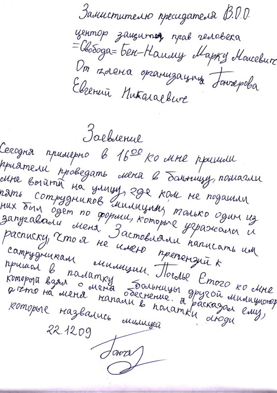 Пострадавший от милицейского налета на палаточный городок в Симферополе ЕВГЕНИЙ ГОНЧАРОВ, заявляет о новых милицейских провокациях. На этот раз милиция запугивала Евгения Гончарова при свидетелях на территории симферопольской больницы. Евгений Гончаров, пострадавший от бандитского налета милиции на мирный палаточный городок ВОО «Центр Защиты Прав Человека «СВОБОДА», размещенный напротив Крымского главка милиции, заявляет о милицейских угрозах в свой адрес. По словам Евгения Гончарова, примерно в 16 часов 22 декабря к нему в больницу прибыли пять сотрудников милиции, один из которых был в форме. В присутствии друзей Евгения Гончарова, которые пришли навестить парня, сотрудники милиции окружили его, запретили звонить по мобильному телефону, и путем угроз и шантажа заставили написать расписку об отсутствии претензий к сотрудникам милиции в связи с полученными им травмами 20 декабря. О произошедшем был немедленно проинформирован дежурный по Крымскому главку милиции, который однако не принял никаких мер. По данному факту, на основании заявления Евгения Гончарова, мною направлены заявления высшим должностным лицам Украины, сообщил правозащитник. Напоминаем, что в ночь на 20 декабря пятеро неизвестных, представившихся сотрудниками милиции, разрушили палаточный городок Крымского регионального комитета ВОО «Центр защиты прав человека «Свобода» напротив Главного управления МВД Украины в АРК и избили участника акции протеста Евгения Гончарова. Об этом он сообщил корреспонденту Крымского информационного агентства.