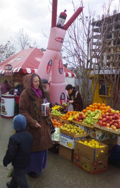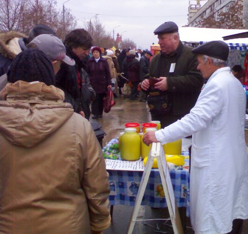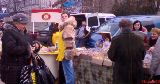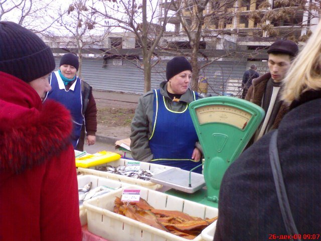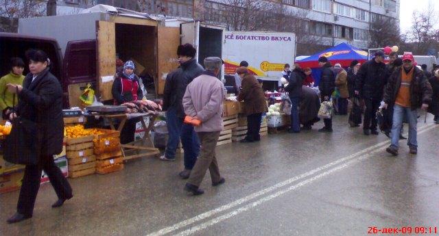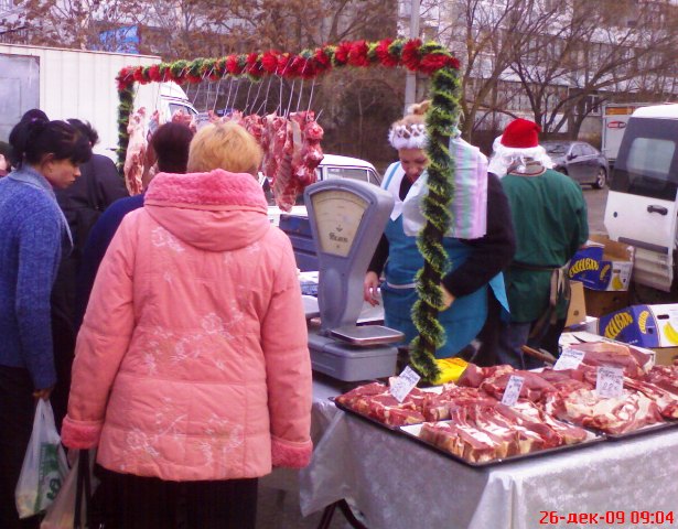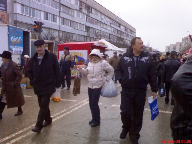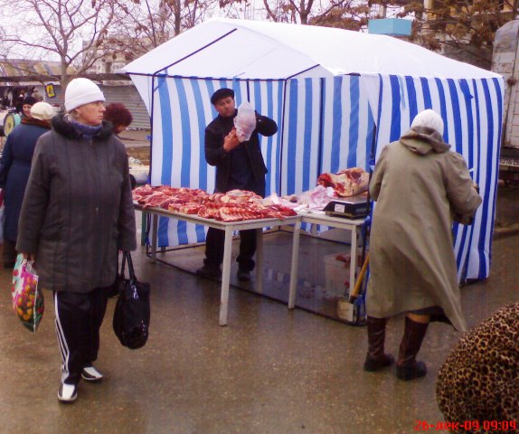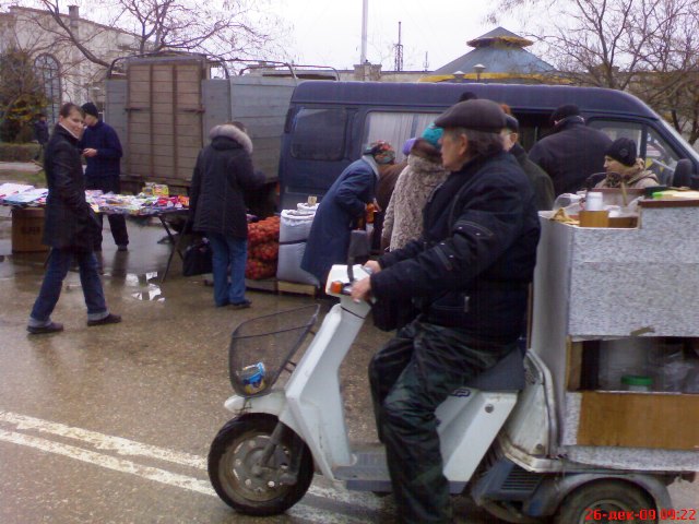 Крым. На календаре декабрь 2009 года. Накануне, двадцать пятого, всю ночь лил дождь, а с телеящика черный пиарщик Юлии Тимошенко лысый Мустафа, уподобившись Моське из знаменитой басни Крылова, тявкал на Виктора Януковича в «свободе слова» Савика Шустера.  А утром в Евпатории ни дождя, ни Савика с его моськой Мустафой и чёрнопиаровской свободой. Крымский папарацци берет с собой большой мешок, телефон марки «Сони» и на евпаторийскую ярмарку, поглядеть на клоунов и скоморохов, да прикупить кой-чего к праздничному столу. Не все ж время пялиться в телеящик с Шустером и ему подобными борцами за иноземную зелень. На перекрестке Интернациональной и Победы машина ГАИ и милиционер с палочкой. К девяти – полгорода уже на ярмарке. А почему бы и не сходить за товаром, если накануне врачам и учителям выдали аванс. Цены – ниже рыночных процентов на десять. Перечислять не буду, чтоб не утомлять и не уподобляться некоторым лысым из телеящика. Кому интересно смотрите на фото. Там три в одном: товар, цена, качество. Хотя и тут не без обмана. Сгнивший бок хурмы, вовнутрь. Да и с маслом сливочным – проблемы. Евпаторийский молокозавод распродает последнее по 60 гривен за кг. А того, что в пачках, уже нет и до Нового года не будет. Исчезла из продажи и евпаторийская брынза. Говорят, что нет сырья, коровы не доятся. То ли забастовка на фермах, то ли сезонное ФЕ от дойного стада производителям масла и брынзы. Можно, конечно, купить нечто в пачках из Украины, но евпаторийцы предпочитают свое – евпаторийское. Говорят, надежнее и вкуснее. А то, что везут в Крым из-за Перекопа, для отдыхающих из Украины. Пусть кушают свое, национальное вместе с Мустафой и Савиком Шустером.
