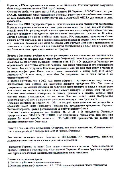 Самое смешное, то, что Москаль выдал мне справку, в которой четко написано, что в ней должны быть отражены No. и дата Указа Президента Украины о прекращении гражданства Украины. Все бумажки Москаля являются ничтожными с момента их написания, но для перестраховки я направил иск в суд. Мои интересы в суде будет представлять адвокат, так как я сам, после избиения в милицейских застенках, обратился в травмопункт и направлен в больницу. Теперь суд и поставит точку в этом деле, сообщил правозащитник.
