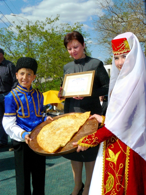Самый большой чебурек в миреБывшая Всесоюзная детская здравница Евпатория десятый раз попала в Книгу рекордов Украины. Среди  рекордных достижений Евпатории самый большой флаг Украины, самая большая демонстрация медработников, самое большое количество «живых скульптур» и вот теперь самый большой чебурек в мире. Предваряло измерение и взвешивание самого большого чебурека в мире концертная программа юных талантов из национальных общин Евпатории, в которой приняли участие крымскотатарский, караимский, русский танцевальные ансамбли. Несколько тысяч зрителей тепло принимали юных артистов, но ждали главного – САМЫЙ БОЛЬШОЙ В МИРЕ ЧЕБУРЕК. Ожидали это чудо кулинарной мысли и несколько десятков фотокорреспондентов и телеоператоров, откомандированных в Евпаторию из Москвы, Киева, Симферополя. Самый большой чебурек в мире, по замыслу организаторов этого кулинарного действа, должен был пробить Евпатории рекламную дорогу на центральные и республиканские телеканалы России, Украины, Казахстана и республики Беларусь. И вот, наконец, самый большой в мире чебурек пожарен и измерен. Весил чебурек полтора килограмма, его длина превысила полметра, а ширина 30 см. Специально для чудо-чебурека  выделили ручной работы поднос, на котором рекордсмена и  вынесли юные артисты в национальных крымскотатарских костюмах.