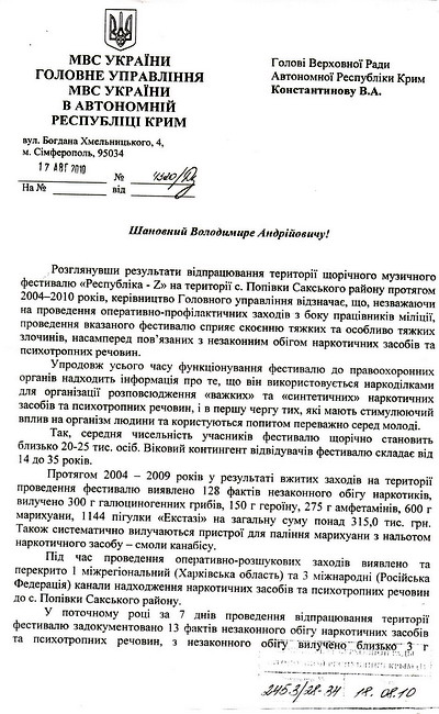 «Уважаемый Владимир Александрович, – обращается на «мове» к главе крымского парламента главный крымский милиционер, – рассмотрев результаты отработки территории ежегодного музыкального фестиваля «Республика – Z» на территории с. Поповки Сакского района на протяжении 2004 -2010 годов, руководство главного управления считает, что, несмотря на проведение оперативно-профилактических мер со стороны работников милиции, проведение указанного фестиваля содействует совершению тяжких и особо тяжких преступлений, в первую очередь связанных с незаконным оборотом наркотических средств и психотропных веществ».