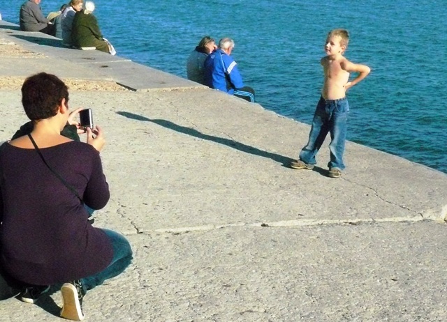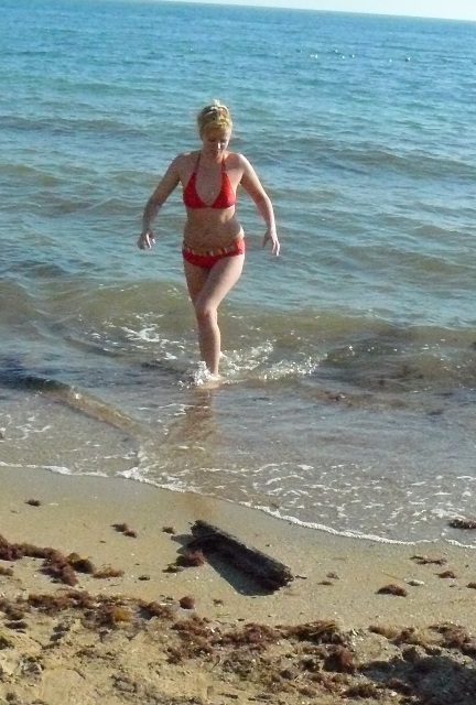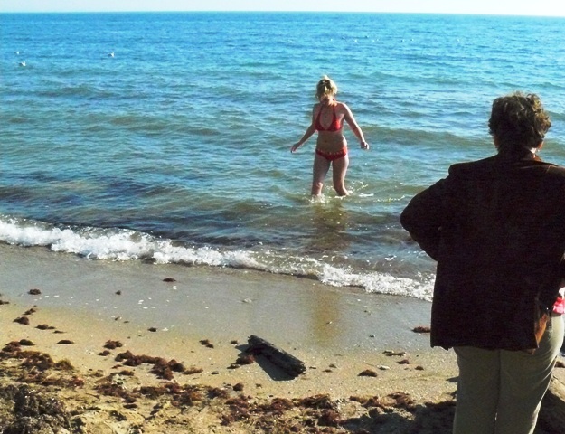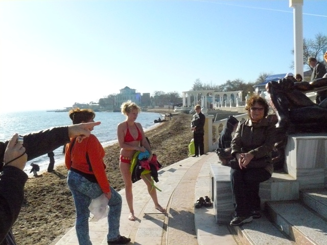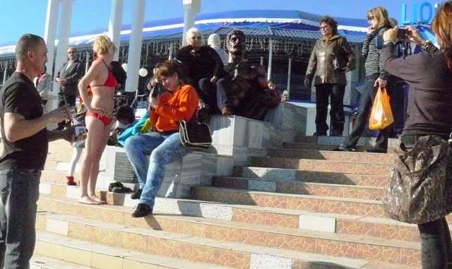 Фото. Новости Евпатории. Женщина в красном.  Главная новость Евпатории – курортный сезон в ноябре для тех, кто желает позагорать под зимним солнцем. Несмотря на летнюю ноябрьскую жару, местные жители на пляж приходят в куртках. Пройти по улицам в костюме вроде «неприлично», все-таки ноябрь на улице. Зато на пляже можно надеть красный купальник и уйти в море. Совершив короткий заплыв в прохладной воде, дама в красном выбралась из воды, позируя многочисленным фотолюбителям. Она медленно прошла по песку к евпаторийскому Гераклу и даже немного позагорала. Ее примеру последовали и другие дамы, отлавливающие ультрафиолет на пляже ЦКП. Еще один морозостойкий ребенок позировал маме на набережной имени Валентины Терешковой. А чего бояться, когда на солнце 24 градуса. Да и прогноз до четверга 18-19 градусов, а вода в море плюс 15. Хотите позагорать в ноябре, тогда вам в Евпаторию! А тем, кому лень суетиться и брать билеты на самолет, советуем посмотреть, как это делают другие. Прямо сейчас. Евпатория. Море. Пляж.