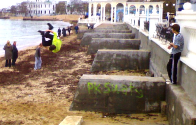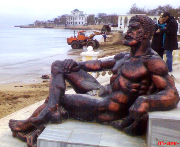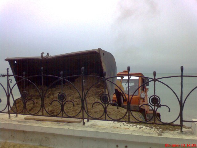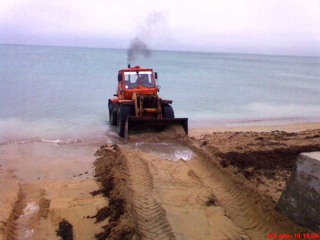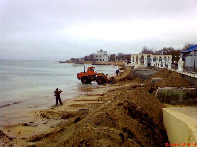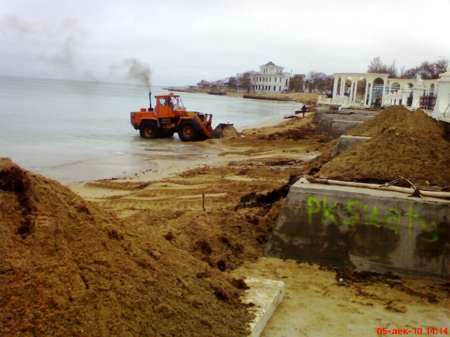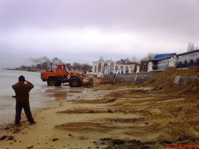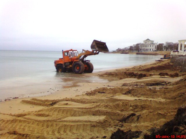 В Евпатории бульдозеры спасают пляжи от исчезновения. Минувшие выходные запомнились евпаторийцам резкими перепадами температур. Суббота была по-летнему жаркой и жители города тут же отправились к морю. На пляже в Курзале начинающие спортсмены крутили сальто, девчонки снимали полеты над морем на видео, а молодые мамаши чинно прогуливались по парку с колясочками. Все изменилось уже в воскресенье. С утра температура стала по-настоящему зимней, а в парке имени Фрунзе на том самом месте, где мальчишки еще вчера крутили сальто, бульдозер сгребал песок в огромные кучи к защитной стенке. Технология была простой. Вначале бульдозер заезжал в море, опускал ковш и тащил на берег песок с мелководья. Таким образом, защитники природы пытались, хоть как-то отвоевать пляж у моря. До весны, песок вместе с водорослями пролежит у стенки, защищенный от ветра и штормов. А ближе к лету тот же бульдозер вернет его на место. За работой бульдозера с интересом наблюдали евпаторийские фотолюбители. Запечатлел этот важный момент в подготовке пляжа к зиме по-евпаторийски и крымский папарацци. Кстати, многие посетители нашего сайта поддержали инициативу городского головы Евпатории Андрея Даниленко открыть большинство пляжей города для евпаторийцев и гостей курорта, сделав их коммунальными.