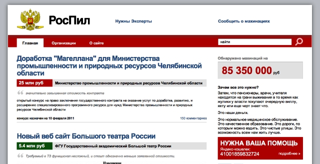Лучший блог политика и общественного деятеля – у Алексея Навального. Его пост «Как пилят в Транснефти» признан лучшим блог-расследованием. «Прежде, чем вы начнете читать – загляните в свой бумажник. Может вы и не заметили, но из него пропало примерно 1100 рублей. Не так много, для каждого из нас, но эту сумму украли у каждого совершеннолетнего жителя России. Всего, по нашей оценке, по ходу этой истории было украдено не менее $4 млрд долларов». Навальный проводит расследования, посвященные распределению средств в разных компаниях. Он создал сайт с красноречивым названием «РосПил», где можно сообщить о махинациях. На сайте работает счетчик, показывающий, какие суммы были израсходованы не по назначению (сейчас это 85 350 000). «Зачем все это нужно? Затем, что пенсионеры, врачи, учителя находятся на грани выживания в то время как жулики у власти покупают очередную виллу, яхту или еще черт знает что», — объясняет Навальный. Он также собирает деньги на то, чтобы проводить расследования, у него уже есть 3,8 млн рублей от граждан.