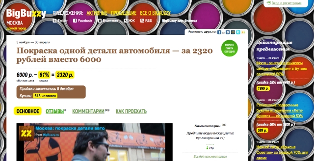 На Bigbuzzy.ru предлагали купить купоны на покраску одной детали машины за 2320 вместо 6000 рублей, с таким предложением выступил техцентр «Black Horse». Купонов было продано 631, почти столько же комментариев на странице этого предложения. «Сервис оказался каким-то странным, — рассказал один пользователь, — они продали купонов больше, чем смогли потом обслужить. В итоге моя машина простояла там вместо 3-4 дней около двух недель, ее собирали обратно впопыхах уже перед самой выдачей и хотели украсть щетку для снега из салона». Про щетку, кстати, пишет чуть ли не каждый второй клиент.