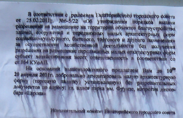 ImageБывает, что одна фотография расскажет о человеке намного больше, чем целая книга. Вот, и сегодня, совершенно случайно в кадр попал журналист с раскрытым бумажником и диктофоном в руке. Ну, что сказать о бумажнике, дорогой бумажник, кожаный, а главное вместительный. Туда можно складывать не только украинские гривны, но и доллары США, и подорожавшие ЕВРО. Человек с таким бумажником в руках вызывает уважение, а сам бумажник подсказывает некоторым несознательным гражданам, как правильно нужно общаться с его хозяином. А уж когда хозяин бумажника прикладывает к нему диктофон, то тогда, как говорили  друзья детства,  просто туши свет! Но наш рассказ сегодня не о владельце вместительного кожаного бумажника. Пусть он здравствует и процветает, пока в Евпатории живут авторитетные спонсоры готовые на все. Тема нашего фоторепортажа проста и понятна. 21 апреля 2011 года в Евпатории провели «чистый четверг». Весьма интересно он прошел в парке Фрунзе. В том самом парке имени Фрунзе, который стараниями местных предпринимателей превратился в одну большую барахолку с ресторанами, барами и буфетами. Причем хозяева жизни, устанавливая на газонах ларьки и ларечки, рубят направо и, налево не только тонкий кустарник, но и огромные крымские сосны. А что ж народ? Народ не молчит. Люди приходят в общественную приемную Партии регионов с жалобами на предпринимателей – беспредельщиков, пишут жалобы в горисполком, требуют навести порядок, спасти погибающие деревья. И вот, 21 апреля депутаты горсовета решили выяснить, а на каком основании устанавливают прямо на газонах торговые палатки.
