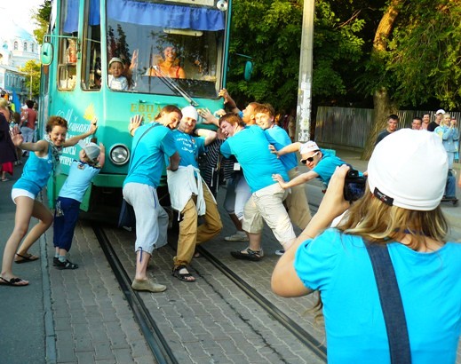 В Евпатории, на улице Революции, господа артисты толкнули евпаторийский трамвай. Театральные подмостки в Москве сотрясает громкий скандал. В то время как в театре на Таганке господа артисты собирают пресс-конференции, произносят обидные реплики, и требуют с Юрия Любимова 500 баксов, в Евпатории их юные коллеги… толкнули трамвай (обновлено).  Господа артисты толкнули трамвай вместе с пассажирами на улице Революции во время парада участников 16-го Международного фестиваля «Земля. Театр. Дети». Этого не было в сценарии. Подошли. Окружили и с громкими криками… толкнули. После чего веселая толпа с пионерскими кричалками восьмидесятых годов прошла по набережной имени Терешковой, пугая «незаконных» шашлычников и их голодных клиентов. Конечным пунктом парада была обозначена Фестивальная площадь у морского вокзала. Площадь к приходу колоны приукрасили, освежили, облагородили стульями, сценой и прожекторами. В первых рядах партера сидели: заместитель городского головы Евпатории Сергей Стрельбицкий, депутаты Евпаторийского горсовета, представитель министерства культуры АРК и главное лицо фестиваля, депутат Верховного Совета Крыма, генеральный директор МДЦК Нина Пермякова. Вот, собственно и все. А дальше, строго по сценарию было торжественное открытие, поздравления и представление творческих коллективов, гала-концерт и традиционный фейерверк. Единственным отличием от пятнадцати предшествовавших стало то, что организаторы фестиваля ударились в ностальгию и, включив «машину времени», вернули юных артистов в свое «пионерское детство» с пионерскими кострами, утренней гимнастикой и песнями под гитару. Правда, самого пионерского костра, у которого признавались в первой любви родители участников фестиваля, мы так и не увидели. (Приносить и разжигать запретило МЧС). Но, несмотря на запрет и фактическое отсутствие «живого» костра, все остальное было таким, как тридцать лет назад, когда юных артистов не было еще и в проекте.