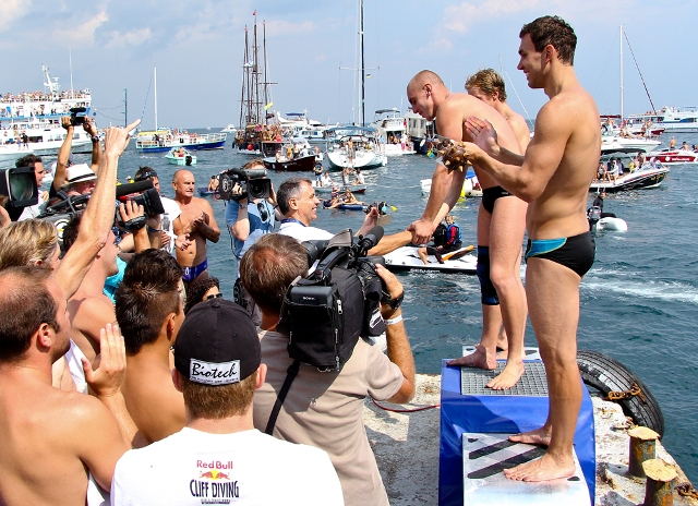 СПРАВКА: RED BULL CLIFF DIVING World Series – мировая серия соревнований по акробатическим прыжкам в воду, которые завоевали необычайную популярность, благодаря зрелищности и мастерству участников – лучших дайверов мира – и, конечно, невероятным местам проведения. За 3 года существования мировой серии RED BULL CLIFF DIVING спортсмены совершали прыжки с горных скал в самых живописных природных ландшафтах, с древних крепостей, возвышающихся над водой, и современных сооружений, построенных в акваториях городов. С марта по сентябрь 2011 года этапы мировой серии RED BULL CLIFF DIVING World Series прошли: - старт в марте в Рапа Нуи (Чили, Остров Пасхи) - в апреле Мексика(Юкатан) - первое соревнование на территории Европы состоялось в Греции (Афины) - в мае во Франции (Ля Рошель) и Италии (Мальчезине) - США (Бостон) - финал в Украине (Ялта).