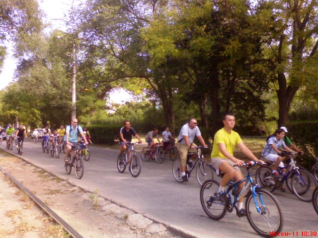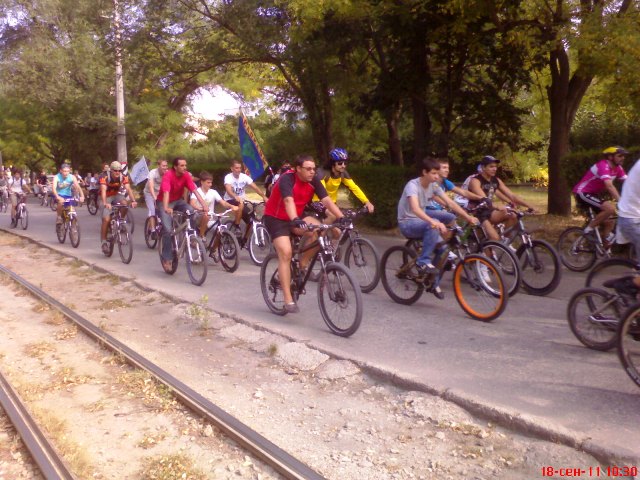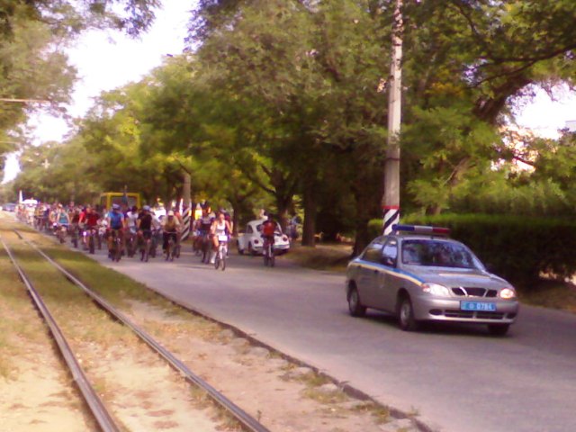 Евпатория. Вело пробег18 сентября утро началось с вздорных слухов и утренней паники автолюбителей.  - Весь город в гаишниках. На каждом перекрестке     стоят. Не иначе, Януковича ждут!- Порадовал меня знакомый автолюбитель. Но в эту сплетню я не поверил. Ну, какой Янукович, когда в сквере афганцев огромная куча мусора в разорванных черных пакетах. Если б Януковича ждали - вывезли бы давно, а так лежит, воздух отравляет своими запахами и некультурным видом. Похоже, ГАИ засуетилось по другой причине. Выхожу на улицу Полупанова и на остановке «Лиман» меня нагоняет машина ГАИ и группа товарищей на велосипедах. Назвать их всех спортсменами – язык не поворачивается. Так, любители. А кое-кто сел на велик, чтобы продемонстрировать, что еще может не только прилавок с пивом атаковать, но и проехать с ветерком по родному городу. Делаю несколько снимков «на телефон» и ухожу по пересеченной местности к озеру «Мойнаки», потому что пресс-служба Евпаторийского горисполкома объявила народу евпаторийскому неделю мобильности. Надо ходить пешком, ездить на велосипедах и в трамвае. Трамвай в Евпатории, вроде, экологически чистый и вечно убыточный. А вот, на машине с выхлопными газами – ни-ни! Но это еще, что. Кульминация всего этого действа случится 22 сентября.