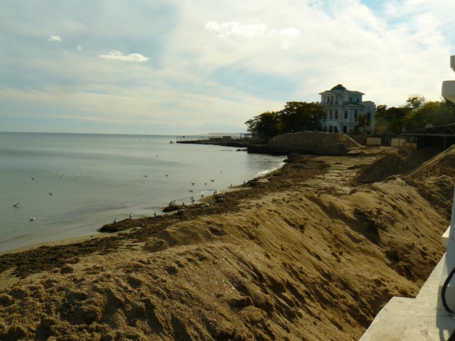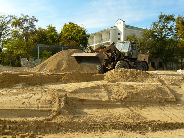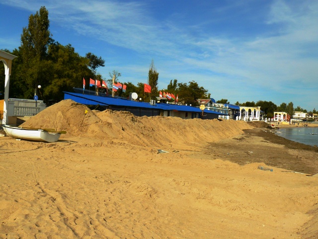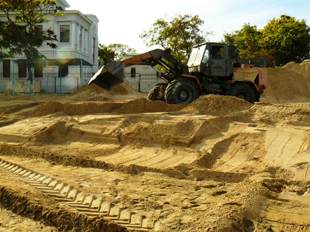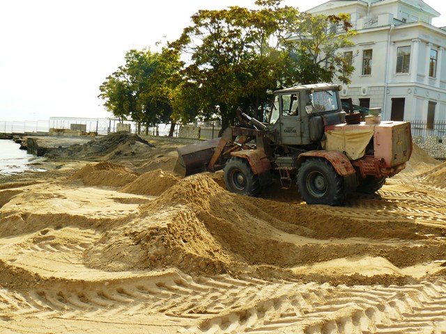 На евпаторийском пляже в парке имени Фрунзе продолжается эксперимент по сохранению песка… при помощи бульдозера.  Каждую осень арендаторы на пляж запускают бульдозер, который срезает верхний слой песка, собирая его в огромные кучи. В таком виде песок хранят до открытия следующего курортного сезона. Местные умельцы считают, что спасти песчаный пляж от зимних штормов в парке имени Фрунзе иным способом невозможно. В то же время на других пляжах Евпатории к природе относятся с большим уважением. Насколько нам известно, «бульдозерную технологию» для зашиты песка от ветра и шторма на других пляжах Евпатории не используют. Недовольны этим и туристы, которые еще не завершили курортный сезон и продолжают устраивать заплывы в море. Кучи песка вместо пляжа в центре курортной зоны портят облик детского курорта. Дело в том, что парк имени Фрунзе и зимой остается главной прогулочной набережной города, куда ежедневно приходят сотни туристов и местных жителей. Но арендаторы, придумавшие «бульдозерную технологию» для сохранения пляжа, на подобное недовольство граждан не обращают внимания. Бульдозер на пляже – это дешево и практично. Всего несколько дней работы и до будущего курортного сезона можно спать спокойно, не задумываясь о том, каким образом потом придется восстанавливать пляж.