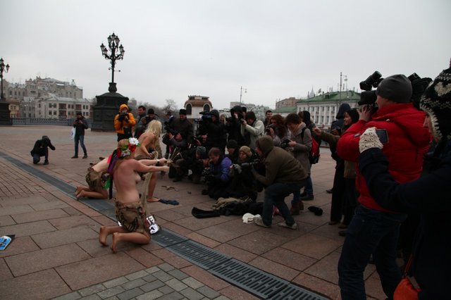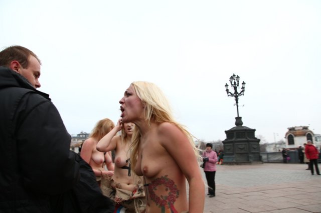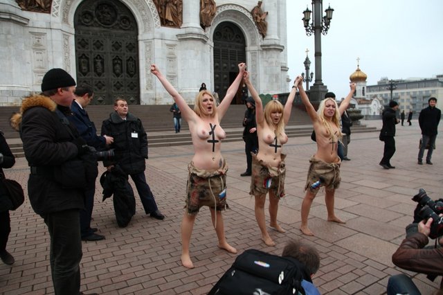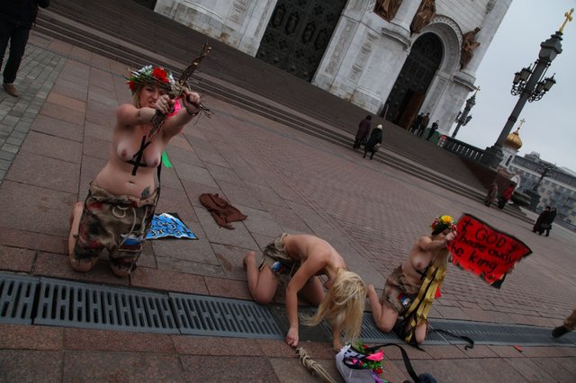 Украинские феминистки разделись в Москве. Фейсбушные акции протеста в Москве превратились в голый фарс группы FEMEN.  Очередное сообщение на официальном сайте Украинского женского движения FEMEN смахивает на шизо. Судите сами. «Украинское женское движение FEMEN обратилось к Христу Спасителю возле одноименного храма в Москве. Активистки FEMEN призвали все небесные и земные силы сопутствовать свободомыслящей России в ее борьбе с кремлевским самодержавием. Мы вдохновлены действиями российской непарламентской оппозиции, не признающей результаты российского избирательного лохотрона. С нетерпением ожидаем 10-го декабря – даты рождения Новой России без воров, жуликов и политзаключенных» - заявили топлесс-активистки, протестуя у входа в оплот путинской диктатуры. Активисткам FEMEN удалось обмануть московскую полицию и безнаказанно провести несанкционированную акцию в центре Москвы. Но у одной из активисток вывих руки, полученный от схватки с охраной. Имена активисток не указываем из соображений безопасности». Лично меня больше всего порадовала фраза: «10-го декабря – дата рождения Новой России без воров, жуликов и политзаключенных». Это про Немцова-то, который то и дело выступает на оранжевых тусовках в Киеве, поливая и подстрекая! А как быть с его подельниками-друзьями Юлией Тимошенко и Виктором Ющенко. Самые честные люди на земле! Ну, просто клейма ставить негде. Ну, Бог с ним, с Немцовым и полуголыми феминистками из Киева. У каждого своя роль. Мне лично непонятно одно, как это в «полицейской России» полуголым украинским бабам удалось устроить голую фото сессию у стен православного храма. Оказывается, не следят в Москве за инакомыслящими, не ловят и не пресекают. А вот, на Украине, с голыми бабами поступают, как с настоящими мазохистками: кидают на землю, бьют и царапают ногтями голые груди. Дамы из киевских борделей говорят, что «жертвы репрессий» получают многоразовый оргазм прямо на асфальте. Так это или нет, судить не нам – киевским проституткам виднее. У народа же возник другой вопрос, почему на полуголых не бросилась московская полиция?