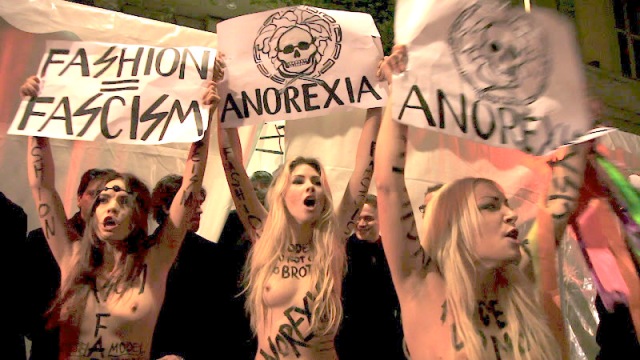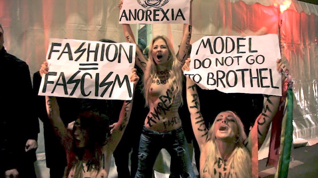 Versace не пострадал. Берлускони жив! Жертв и разрушений - нет. Акция женского движения FEMEN "Fashion fascism" в Италии. Вчера вечером, активистки FEMEN атаковали церемонию открытия показа Versace на Milan Fashion Week. Об этом сообщила пресс-служба FEMEN. За пять минут до начала показа активистки перекрыли вход в Дом Versace в Милане, скандируя "Фэшн фашизм" и "Модель не иди в бордель!". FEMEN акцентирует внимание на кабальной эксплуатации женщин со стороны босов фэшн-индустрии. Ежегодно жернова модельного бизнеса перемалывают сотни тысяч девушек, пропагандируя блеск и богатство модельной карьеры, навязывая женщинам ложные идеалы, провоцируя реальные болезни. Одураченные фэшн-пропогандой, несостоявшиеся манекенщицы, регулярно пополняют ряды работниц секс-индустрии и пациентов психиатрических клиник. Женщины-потребители "модной" одежды являются подопытными кроликами для маркетинговых отделов модных брендов и под впечатлением от громких имен выкладывают огромные деньги за тривиальный хлам. Полиция Милана и служба охраны Дома Versace попыталась воспрепятствовать работе журналистов, снимающий акцию FEMEN.