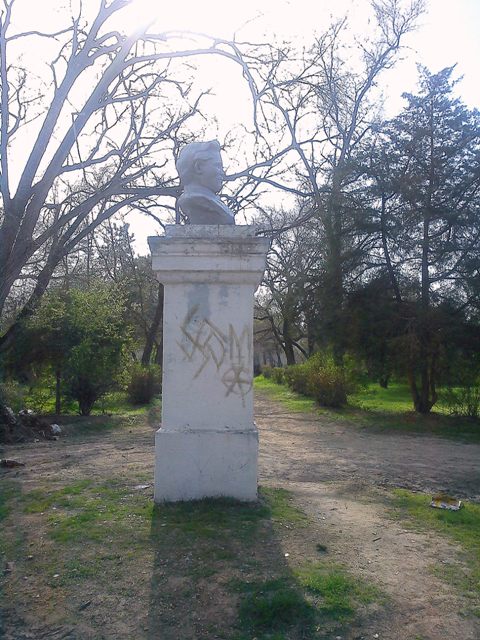 Есть вопросы и к местной милиции. Участковый пункт милиции №1 расположен в сотне метрах от оскверненного неофашистами памятника на той же улице Кирова. Здесь же располагается и контора КП «Курзал», сотрудники которой обязаны следить за состоянием скверов, парков и памятников. Неужели эти господа не видят, в каком состоянии находится этот сквер и свастику на постаменте? Марк Пурим, Депутат Евпаторийского горсовета. Член Партии регионов. Фото Марка Пурима. 7:51 22.04.2012 Крым. Евпатория. Свастика на памятнике в Евпатории.