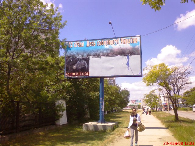 На этом можно было бы поставить и точку. Да эта городская реклама в Евпатории уж больно много вопросов вызывает. Оказалось, что через месяц после торжественного открытия курортного сезона в Евпатории недостает "Биг-морд". Иду я значит по улице Интернациональной, а там вместо счасливо улыбающейся "биг-морды" болтаются на ветру куски то ли "украинской злуки", то ли "соборности Украины"
