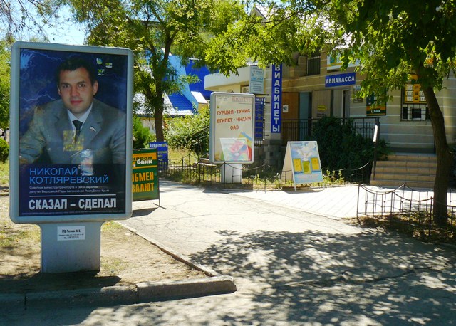 Николай КотляревскийКакой кошмар. Выплыла недавно из подсознания правильного пацана с бандитскими погонялами «Коля-убийца», «Котлета» и «Коля-нардепук» странная мысль. Такая свежая мысль, ну просто настоящий свежак. И звучала эта мысль так: «А почему бы мне не высказаться по поводу биг-бордов. Да не просто в сортире проорать сквозь закрытую дверь,  а взять и изложить, то что орут в сортире в открытом письме к премьер-министру и главе ПР Николаю Азарову. И что ты тут сделаешь, если пришла мысль. И Николай Котляревский  тут же сел, только не подумайте ничего плохого, не в тюрьму, куда его уже много лет пытается отправить Владимир Лутьев за бандитское прошлое, а на деревянный стул и накропал нечто очень и очень умное. И это нечто тут же опубликовал «Евпаторийский объектив»:  «Огромные средства, затрачиваемые Партией регионов на рекламу своей политической силы на внешних носителях, целесообразнее направить на поддержку незащищенных слоев населения или проведение культурно-массовых мероприятий. Партия, которую и так знают все в Крыму, не нуждается в дорогостоящей рекламной кампании, тогда как эти миллионы принесут больше пользы при выполнении реальных дел».  По его мнению, нынешняя избирательная кампания практически ничем не отличается от предыдущих – миллионы гривен тратятся на донесение своих лозунгов с билбордов, размещенных в городах и вдоль трасс".  Ну, прямо не в бровь, а в глаз сказал правильный пацан. И что самое интересное, все, что сказал Котляревский  один к одному про него любимого Николая Котляревского, известного также в Евпатории под кличками: «Коля-убийца», «Котлета» и  «Коля-нардепук». А для того, чтобы освежить память правильному пацану процитируем  «Крымский аналитик» и покажем кое какие фотки из недавнего прошлого борца с наружной политрекламой Николая Котляревского.