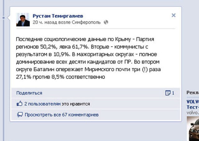 Анастасия Волочкова: Секс с другим человеком я не считаю изменой. Лев Миримский поспорил на десять тысяч баксов с Темиргалиевым. Сегодня читатель «Крымского аналитика» по фамилии Рабинович из Одессы предложил новый поворот в освещении избирательной кампании. Видите ли, Рабиновичу из Одессы, уже тошно слушать обещания кандидатов о том, как они после выборов нас, улицы, город и всех избирателей. Поэтому он попросил этих, которых сегодня обливают грязью все кому не лень, показать в другой позе и на фоне чего-нибудь взбадривающего. И подсказал тему: а слабо показать кандидата в нардепы на фоне скажем голой женщины, секса или такого откровения, чтобы все обязательно посмотрели и обсудили. Нырнув в Интернет, мы тут же нашли две новости в тему. Первая, главная, в которую тычут все. Анастасия Волочкова: Секс с другим человеком я не считаю изменой. А вторая, которая прошла незамеченной в Сети, связана с Миримским и Темиргалиевым, которые поспорили на десять тысяч баксов. Если на округе № 2 выиграет Баталин, то Миримский заплатит Темиргалиеву 10000 долларов. Если проиграет, то Миримский получит столько же от того же. А теперь, главная новость дня: откровения Анастасии Волочковой. «У меня нет мужа, но недостатка в чем-то я не испытываю. Найти мужчину, который бы тебе подходил по всем параметрам, очень сложно. Это касается и сексуальной жизни. Многие боятся говорить о сексе, но ведь партнер, который был бы близок тебе физически и душевно, – большая редкость. Не зря говорят, что секс без любви возможен, а без эмоций – нет. Я уверена, если отношения развиваются гармонично, секс должен быть ежедневным, желательно – два раза в день. Минимум шесть раз в неделю. В то время, когда Анастасия Волочкова говорила сколько раз в неделю надо заниматься с ней сексом, Миримский и Темиргалиев спорили на деньги. Спор был вызван постом, который Темиргалиев разместил накануне на своей страничке в Facebook. В нем он настаивал на будущей безоговорочной победе «регионалов» на парламентских выборах. В частности, по его утверждению, результаты соцопросов показывают трехкратное преимущество Баталина над Миримским в округе №2.