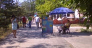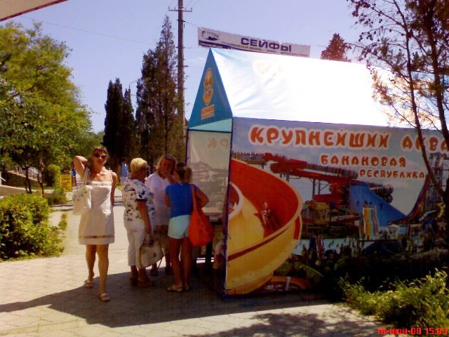 Внутри палатки посадили рекламного агента, который уговаривает отдыхающих приобрести билеты на поездку на весь день в аквапарк за 150 гривен с человека.