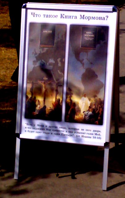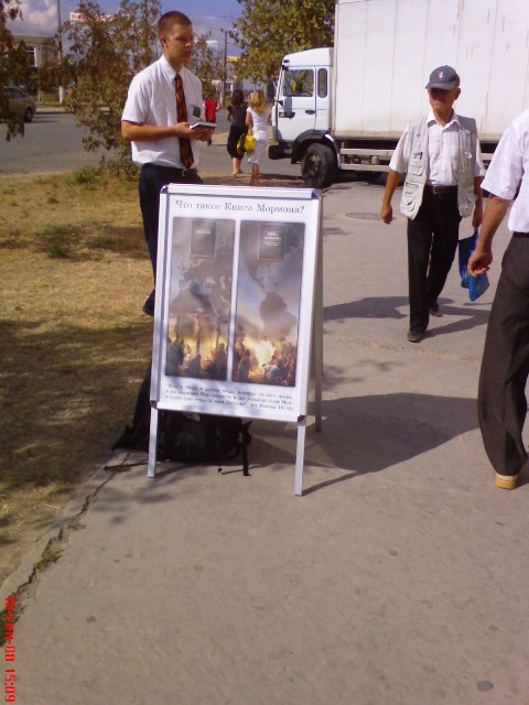 А тут такая свобода американским проповедникам. Похоже не замечают незаконной деятельности американских проповедников на улицах Евпатории и украинские спецслужбы. А может, они ждут громких скандалов, связанных с мормонами, которые сопровождают деятельность этой секты в США. Думаю, что "евпаторийским книголюбам", заинтересовавшимся книгой Мормона, будет полезно ознакомиться и со статьей "Многоженец претендует на славу бен Ладена", опубликованной на сайте "Утро.ру".