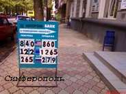 Фото мониторинг курса обмена валют в Крыму. Симферополь - Евпатория. Курс обмена доллара США в обменных пунктах и филиалах коммерческих банков Украины в Крыму пошел вниз.  Крымский папарацци 9-11 сентября 2009 года провел фото мониторинг курса обмена валют в Симферополе и Евпатории. За 100 долларов США в Крыму платили по 810-845 гривен. А продавали те же 100 долларов США клиентам банков в Евпатории и Симферополе по 855-870 гривен. Тысячу рублей России в Крыму меняли на 245-265 гривен. Продавали 1000 рублей России клиентам банков по 270-280 гривен. 100 ЕВРО покупали у туристов по 1200-1220 гривен, а продавали эти же 100 ЕВРО в пунктах обмена валют Евпатории и Симферополя по 1250-1270 гривен. А теперь, для сравнения: курс обмена наличной валюты в Крыму. 8 сентября 2009 года. 100 долларов США продавали населению в пунктах обмена валют и филиалах коммерческих банков по 885 - 895 гривен. А покупали эту же сотню долларов США у туристов из России и республики Беларусь в Евпатории по 865 - 870 гривен. Подробнее о курсе валют в Крыму смотрите на фото мониторинге "Крымского аналитика".