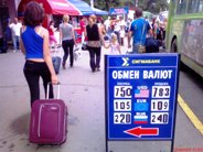 Курс обмена валютГде лучше менять валюту для поездки в Крым: в Москве или в Симферополе?  С таким вопросом читатель  «Крымского аналитика» из Москвы обратился в редакцию. К сожалению однозначного ответа, на этот вопрос у нас нет. Если весной мы предлагали приезжать в Крым  с рублями России, то в разгар курортного сезона мы не рискуем давать советы туристам. И  дело даже не в том, что курс обмена валют в России и на Украине пляшет украинский  гопак, вскакивая и приседая по несколько раз в день.  Для того чтобы провести точные расчеты,  с чем выгоднее ехать на отдых в Крым, мы должны знать реальный курс обмена рубля к доллару в Москве и других городах России. Поэтому, мы не даем советы туристам, с какой валютой лучше ехать в Крым, а показываем на фото мониторинге реальный курс обмена наличного  российского рубля и американского доллара на украинские гривны в Крыму.  17 июля 2009 года крымский папарацци фото мониторинг курса обмена валют провел в Евпатории. За 1000 рублей России в пунктах обмена валют Евпатории 17 июля 2009 года предлагали  235 – 237 гривен. А продавали клиентам коммерческих банков эту же тысячу рублей России за 245 – 255 гривен. 100 долларов США 17 июля 2009  в Евпатории можно было обменять на  775 – 785 гривен. Продавали населению сто баксов в пунктах обмена валют по 795 - 805 гривен. 100 евро в пунктах обмена валют Евпатории 17 июля 2009 года покупали по  1080 – 1090 гривен, а продавали населению эти же сто евро  по 1105 – 1130 гривен.