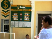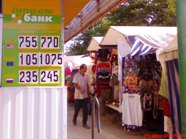 Курс обмена валют на 27, 28, 29 и 30 июня 2009 года. Украина. Крым. Евпатория. На Украине очередной праздник. Ближайшие три дня народ гуляет на пляжах, дачах и огородах. Гулять будет и Национальный банк Украины. В связи с массовым загулом народа на Украине, в Киеве Национальный банк Украины установил следующий официальный курс гривны по отношению к основным иностранным валютам на 27, 28, 29 и 30 июня 2009 года. 100 долларов США до конца июня 2009 года равен 763.0300 гривна. 100 евро = 1075.5671 гривна. 10 рублей России = 2.4520 гривна. А теперь, для тех, кто не понял: (Офіційний курс гривні щодо іноземних валют 30.06.2009. Детальніше: 100 доларів США = 763.0300. 100 евро = 1075.5671. 10 рублів Росії = 2.4520). «Крымский аналитик» в отличие от тех, кто уже гуляет и отмечает нечто эфемерное - КОНСТИТУЦИЮ УКРАИНЫ, продолжает работать в поте лица под жарким южным солнцем. Специально для туристов из Москвы, Санкт-Петербурга, Екатеринбурга, Курска, Новосибирска, Минска и Кемерово был проведен фото мониторинг курса обмена валют. Крымский папарацци 27 июня 2009 года в Евпатории установил следующее: 100 долларов США в пунктах обмена валют покупали у туристов из России и Беларуси по 760-764 гривны, а вот населению эту же сотню баксов в тех же пунктах обмена валют и филиалах коммерческих банков Крыма продавали по 770 - 780 гривен. 1000 рублей в пунктах обмена валют Евпатории меняли на 235 – 236 гривен. А продавали гражданам эту же тысячу рублей России по 246 – 250 гривен. Более подробно о курсе обмена валют в Крыму и Евпатории вы можете узнать, посмотрев на прилагаемые фото.