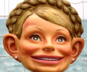 Специальный фоторепортаж из Крыма для туристов из России и республики Беларусь.  Господа туристы и те, кто ждет своей очереди побывать в Крыму и отдохнуть на набережной имени Валентины Терешковой. Для тех, кто не знает, – Валентина Терешкова - первая женщина космонавт в мире. Так вот, специально для любителей ночных кошмаров. Жуткий аттракцион с премьер-министром Украины Юлией Тимошенко. Представьте на секунду: море, закат, крымская жара и повешенная на стене женщина с косой. А в глазах у нее не кровавый мальчик, депутат из БЮТа, которого обвиняют в убийстве, а самое что ни на есть Черное море. А сверху белая фальшивая коса. Ужас! Кошмар! А вам, ЭТО предлагают примерить на себя и совсем НЕ ДАРОМ, а ЗА ДЕСЯТЬ ГРИВЕН. Маленький мальчик визжит на всю набережную: «Не хочу быть Юлей!». И он прав. Зачем ребенку этот кошмар в окружении таких же ужасных и знаменитых, но с пустыми глазами, в которых плещется море. Тогда сунь голову в дырку – предлагают мальчику - и изобрази из себя что-то большое и толстое "с приветом из Крыма". Мальчик отказался, а дама взобралась на коня, и ее сняли за десять гривен… на свой фотоаппарат. Теперь у нее этот искусственный конь останется навсегда в одном флаконе с «приветом из Крыма».
