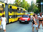 «Крымский аналитик» обнаружил в Евпатории особо опасное место для пешеходов на улице Революции, в районе мечети Джума-Джами.  На улице Революции съемочная группа «Крымского аналитика» оказалась не случайно. Нас привело туда письмо от Зинаиды из Москвы. Женщина рассказала, как у остановки трамвая в районе мечети Джума-Джами она чуть не оказалась под колесами такси. «Когда подъехали к трамвайному разъезду два трамвая, люди пошли на посадку. – Пишет Зинаида. - Нас там было человек двадцать. Перед тем, как выйти на дорогу, я посмотрела налево. Удостоверившись, что с левой стороны нет автомобиля (буквально за несколько минут до подхода трамваев со стороны Симферопольской к центру проследовала маршрутка), я шагнула на дорогу и оказалась под колесами такси. Этот автомобиль шел по встречной полосе движения, лавируя между пешеходами. Только чудо спасло мне жизнь. Сейчас я уже в Москве, но этот случай оставил неприятный осадок от поездки в Евпаторию. Я долго думала, писать вам или нет, но на этой остановке может произойти и более серьезное происшествие с весьма странными транспортными средствами: паровозиками и экскурсионными микроавтобусами без окон и дверей. Если таксист на встречной полосе протаранит их, то жертвами станут десятки туристов». Честно сказать, письмо это нас удивило. В Евпатории делается все для того, чтобы обезопасить пассажиров. Устанавливаются новые светофоры, причем водители, как правило, пропускают пассажиров. Во всяком случае, на перекрестках по улице Интернациональной и проспектае Победы можно двигаться без особых проблем. И уж никому и в голову не придет гонять по встречной полосе по проспекту Победы. Но улица Революции оказалась печальным исключением. В минувшую пятницу, 6 августа 2010 года, за каких-то пятнадцать минут мы зафиксировали с десяток нарушений правил уличного движения на улице Революции.