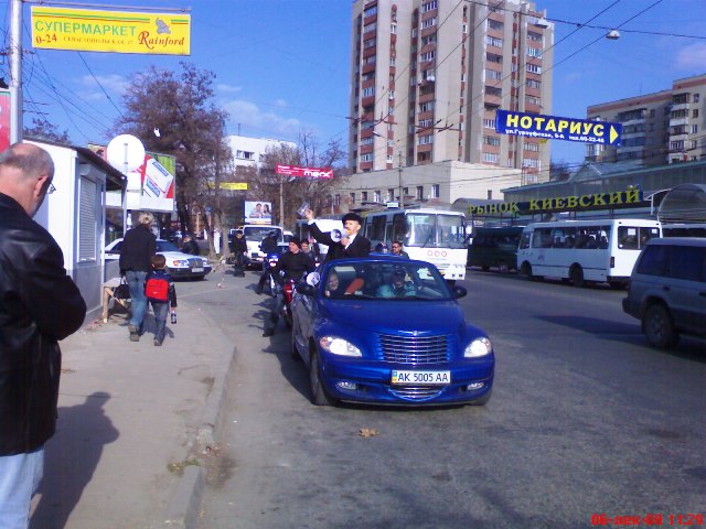 Ленин стоял в автомобиле без крыши, и в мегафон призывал купить какую-то хрень. Чем торговал этот жалкий актеришка, я так и не понял. Да это и не важно. Главное прокукарекал картаво, и уехал со свитой на колхозный рынок, чтобы и там поизоброжать из себя вождя.