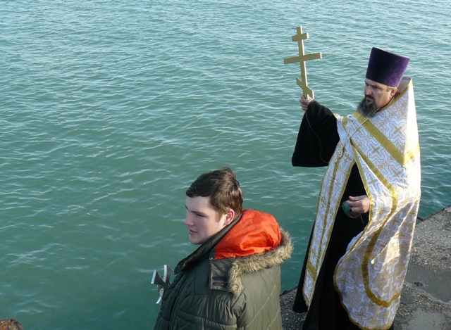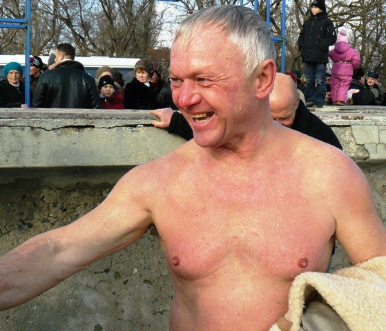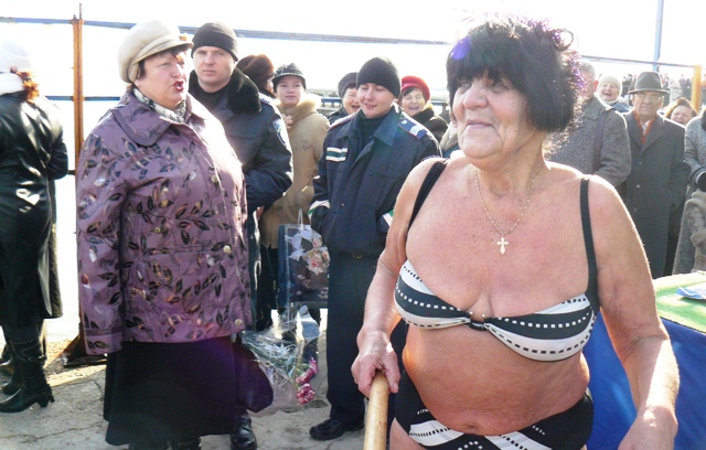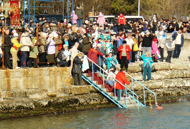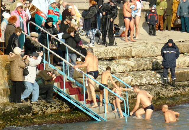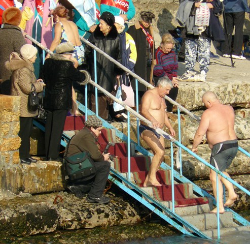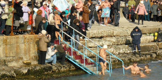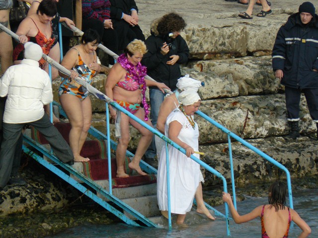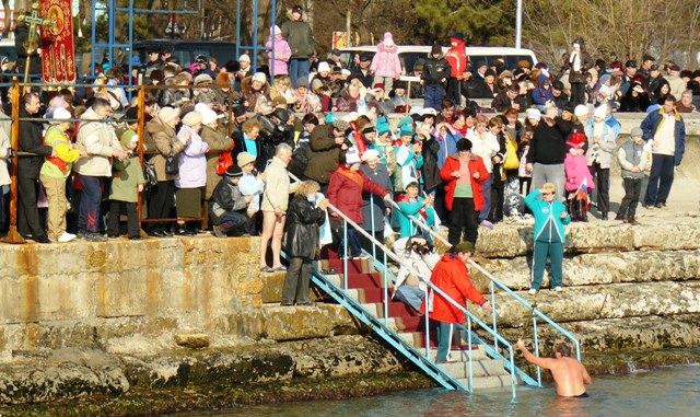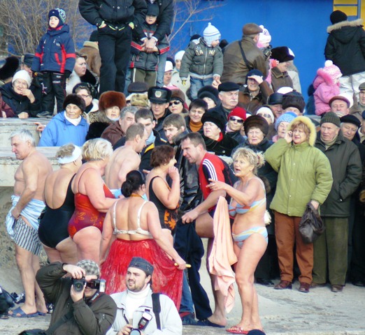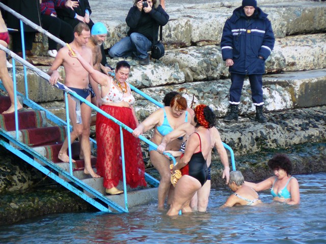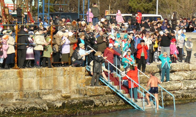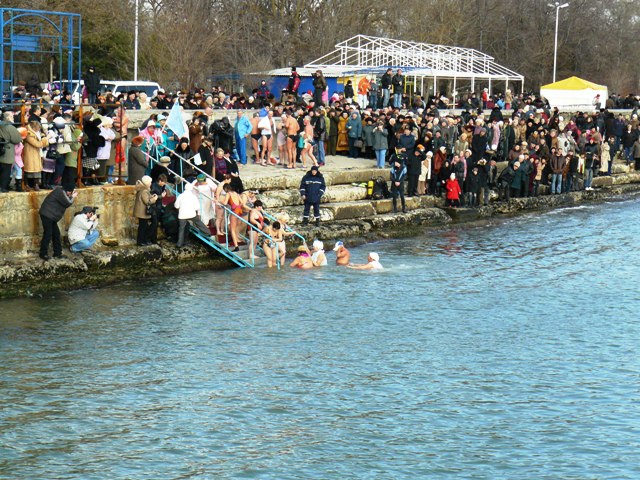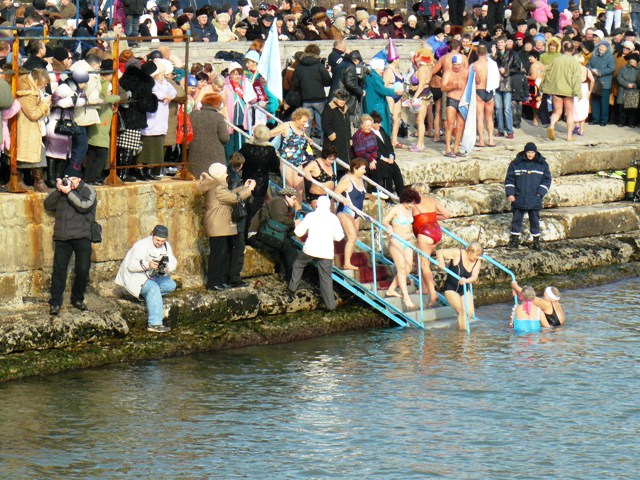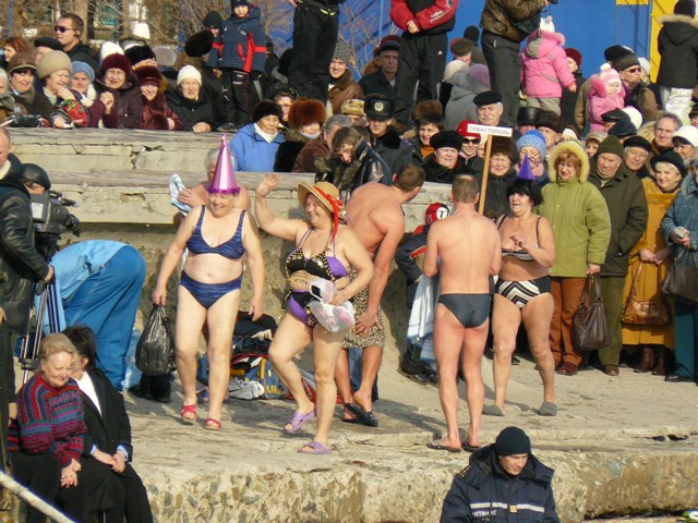 Моржи в ЕвпаторииВ Крыму в Евпатории на набережной имени Терешковой, сегодня 18 января, собрались несколько тысяч тепло одетых евпаторийцев и пару десятков жителей  России, Украины и Крыма в купальниках и плавках. Пока первые щелкали фотоаппаратами, вторые - устроили массовый заплыв в холодных водах Черного моря. Массовости слету моржей добавили верующие из Ильинской церкви. Отец Георгий не только благословил любителей зимнего плаванья, но и бросил с причала в море крест. Один из опытных моржей отыскал крест в морской воде и доставил его на берег. За купанием моржей зорко следили сотрудники милиции и спасатели из МЧС в водолазных костюмах. К счастью, помощь спасателей не понадобилась. Моржи достойно держались в ледяной воде, говорили о том, что купание в море зимой многим из них вернуло утраченное здоровье и помогло излечиться от тяжелых недугов. Кроме взрослых  в заплыве участвовали и дети, которые смело вошли в воду и проплыли несколько метров под присмотром своих родителей – моржей. В этот же день, на территории церкви желающим наливали освященную воду из автоцистерны.