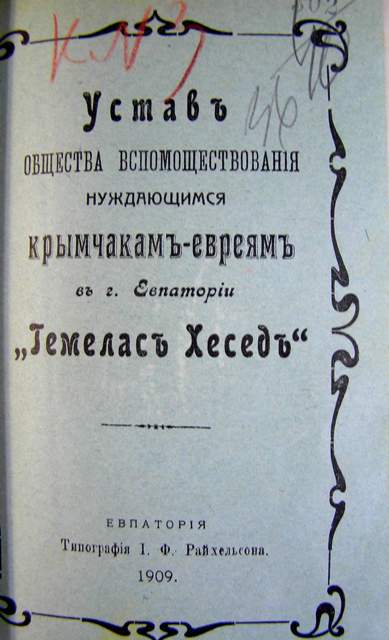В это же время в Евпатории начинает свою деятельность Общество вспомоществования нуждающимся крымчакам-евреям «Гемелас Хесед». Общество предоставляло своим членам беспроцентные ссуды и безвозвратные субсидии, причем последние выдавались исключительно на нужды образования недостаточным учащимся крымчакам. Средства общества состояли из ежегодных членских взносов, вступительных взносов, дохода с капиталов и имущества Общества, пожертвований Общества и посторонних лиц, учреждений, доходов с устраиваемых Обществом драматических представлений, литературных чтений, публичных лекций и т.д.12.