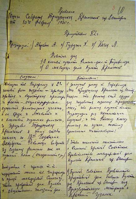 10 февраля 1930 г. состоялось общее собрание трудящихся крымчаков г.Евпатории. Собрание подтвердило решение о закрытии молитвенного дома, под которым подписались все члены общины.19 .