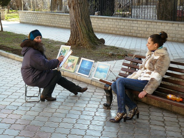 А третий снимок фото коллекции «ЖИВОЙ ЕВПАТОРИЕЦ» был сделан на улице Дувановской в Евпатории. Художник рисовал портрет. Крымский папарацци вначале прошел мимо, потом вернулся, достал фотоаппарат и стал нагло щелкать затвором, в надежде, что художник скажет ему что-то,  и станет «ЖИВЫМ  ЕВПАТОРИЙЦЕМ». Женщина–художник подняла голову, хотела  сказать крымскому папарацци «пару ласковых», но промолчала и оказалась в коллекции среди «ЖИВЫХ ЕВПАТОРИЙЦЕВ».