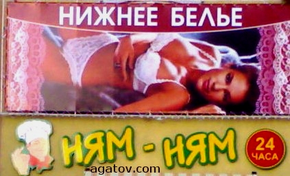 Евпатория рекламаЕще одно мировое достижение в ближайшее время грозят зафиксировать знатоки дурацких рекордов Украины из Евпатории. Лица, приближенные к рекламному бизнесу, предложили впечатать золотыми буквами на страницы истории Украины и Крыма рекламу двойного назначения: «Женское белье НЯМ - НЯМ 24». Это редкостное по содержанию двойное рекламное объявление размещено на здании евпаторийского «Универмага» в центре Евпатории. С одной стороны рекламный плакат вроде бы рекламирует  белое  нижнее белье и лежащую в позе ожидания даму, а с другой – два желтых слова НЯМ-НЯМ и цифры в красном круге 24. Причем НЯМ-НЯМ, почему то  оказался под дамой в белье. Туристы, посещающие Всеукраинский детский курорт Евпаторию, не знакомые с особенностями украинской рекламы, увидев сие творение, по несколько минут стоят как вкопанные, пытаясь разгадать тайные мысли евпаторийских рекламщиков. Социологический опрос, проведенный  6 апреля 2009 года у стен евпаторийского универмага крымским папарацци, показал, что 30%  туристов - в этой рекламе увидели евпаторийский курортный колорит. 40% - отметили, что у обнаженной дамы извращенное отношения к еде  и женскому белью. А оставшиеся 30% москвичей сказали, что на Украине уже давно все идет через НЯМ-НЯМ на букву «Ж».