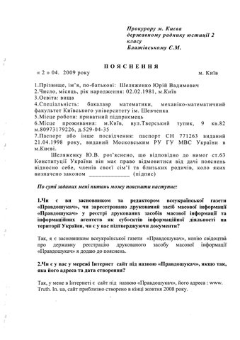 На фото: протокол допроса редактора газеты «ПРАВДОШУКАЧ» Юрия Шеляженко.