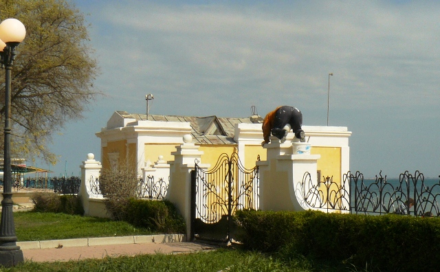 Третье фото из цикла "Живой евпаториец" крымский папарацци выстроил во времени и назвал его "Эволюция женщины в СССР". От спортивной "Женщины с веслом" и "Женщины с шестом", до стриптизерно-привлекательной "Женщины на шесте". Коллекционное фото так и называется: "Женщина на колонне в Евпатории на набережной имени Горького".