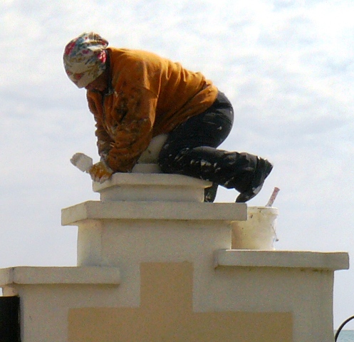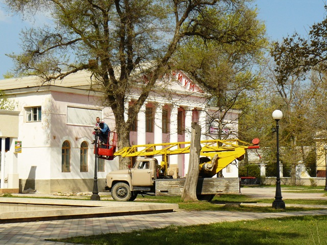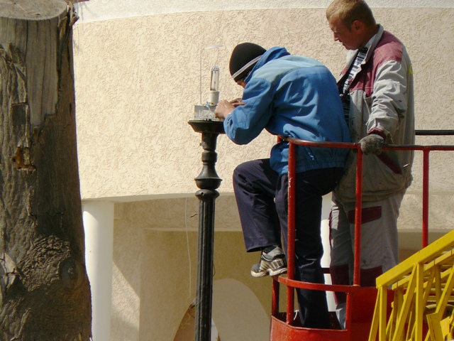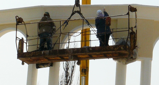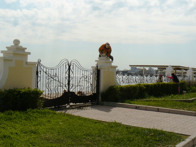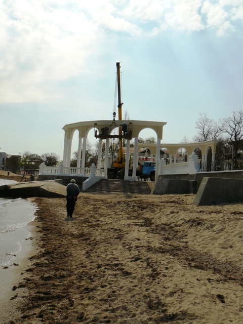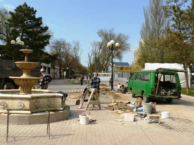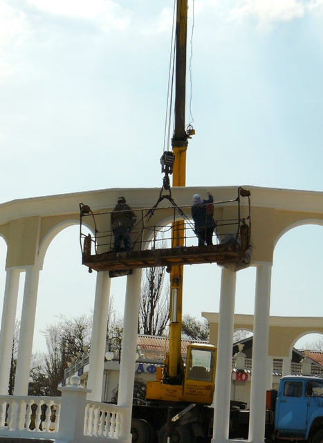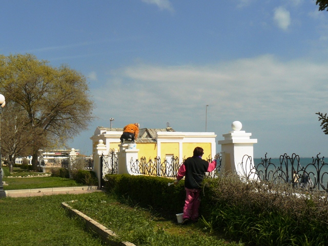 1 мая 2009 года в Крыму будет торжественно открыт летний курортный сезон – 2009. Всего несколько дней осталось до того момента, как по улицам древней Евпатории мимо «живых скульптур» парадом пройдут коммунисты с духовым оркестром, празднуя День международной солидарности трудящихся всех стран и самый высокий в мире царь Нептун на ходулях. А вечером в Евпатории на море устроят «праздник огня» и массовые гуляния по евпаторийским набережным. Но все это будет 1 мая, а сегодня на набережной имени Горького трудовые будни. Маляры красят заборы, электрики вкручивают лампочки, водопроводчики роют траншеи, а строители ремонтируют фонтаны в парке имени Фрунзе. И что интересно, в Евпатории нашлась работа даже для главной достопримечательности набережной - памятнику «Мальчику с гирей». Знаток монументального искусства скривится от этих слов, и пошлет автору на «мыло» гневное «фэ», мол, «мальчик с гирей» не памятник, а скульптура у биоклиматической станции. Автор спорить со знатоком не станет, потому что «мальчик с гирей» - памятник ушедшей эпохи, и он уже никого и никуда не зовет личным примером. А сердобольные строители, спасая спортивный символ Евпатории от холода, накинули ему на плечи спортивно-строительную куртку. Крымский папарацци не смог пройти мимо этого безобразия и запечатлел обновленный евпаторийский символ эпохи с гирей вместе с господами от Юдашкина.