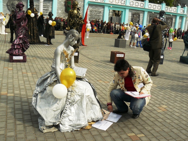 «Примечательно, что именно в день официального старта курортного сезона, здесь же, на Театральной площади (в Евпатории) начнется второй открытый чемпионат живых скульптур – один из самых больших в Европе и самый масштабный в СНГ. В этот раз в числе прочих его ключевыми фигурами станут великие представители литературы и искусства: Александр Пушкин, Фридрих Шиллер, Рембрандт и многие другие известные люди. Организаторами мероприятия выступают исполнительный комитет Евпаторийского городского совета, главное управление инвестиционной политики и внешнеэкономических связей, управление культуры, центр досуга и театр живых скульптур.