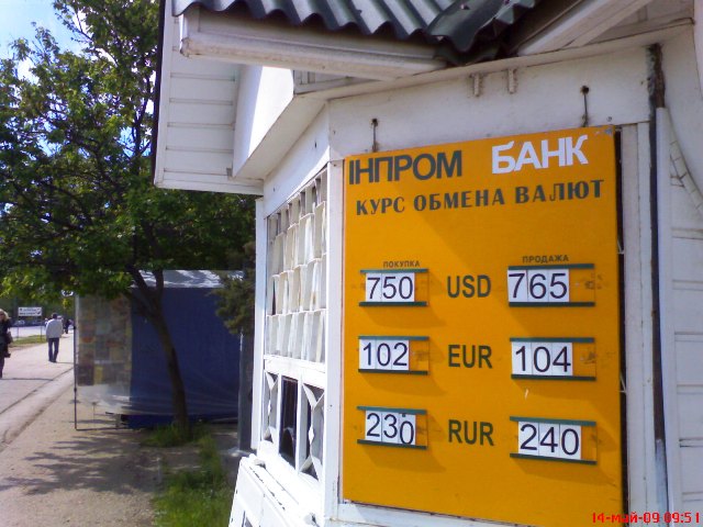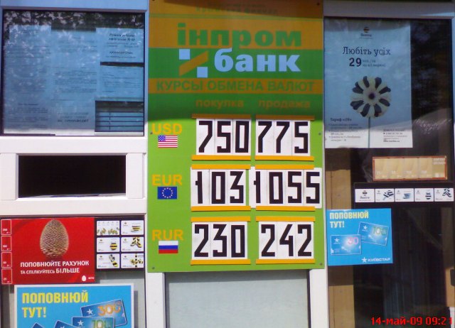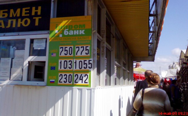 Как показал фото мониторинг «Крымского аналитика» (фото прилагаются) 14 мая 2009 года в Евпатории за сто долларов  США в обменных пунктах платили гражданам от  750 до 760 гривен. За 1000 рублей России давали 225-235 гривен. За 100 евро туристам платили в обменных пунктах валют  Евпатории 1015 – 1030 гривен.