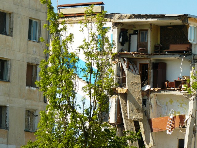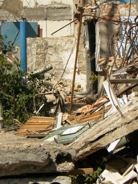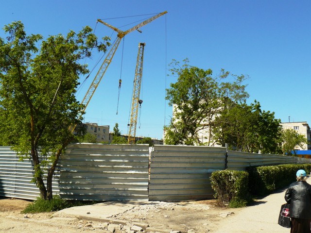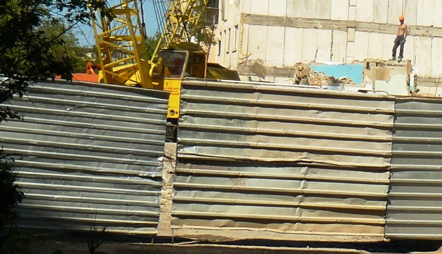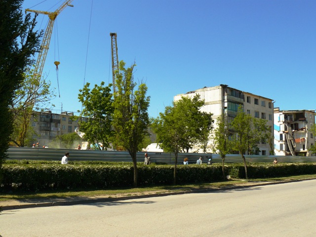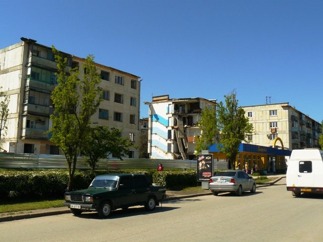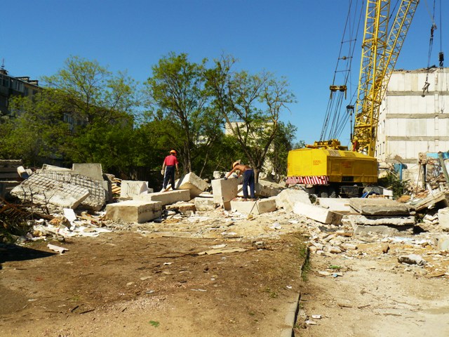 Взорванный дом в ЕвпаторииВ Крыму, в Евпатории продолжаются работы по разборке взорванного многоэтажного жилого дома по улице Некрасова. На эти цели, по данным пресс-службы евпаторийского горисполкома, из госбюджета Украины было выделено 4 миллиона 70 тысяч гривен. Городские власти хотели закончить все работы до начала курортного сезона, чтобы место катастрофы не пугало туристов, но прокуратура Крыма запретила  до окончания следствия вести работы в подъездах, прилегающих к месту взрыва. Поэтому 14 апреля 2009 года  разбирать дом стали со стороны помещения сберкассы. Вначале строители сняли крышу, после чего принялись  извлекать бетонные блоки. Подобные работы в Крыму ранее никто не выполнял, и о сроках окончания работ говорили весьма осторожно. В настоящее время строители завершают работы по разборке 4, 5 и 6 подъездов взорванного дома. Крымский папарацци решил посмотреть, как сегодня идут работы по разборке взорванного дома. Вся территория оказалась загороженной металлическим забором, а ворота закрыты. Чтобы не отвлекать рабочих на показушную фото сессию с постановочными кадрами, крымский папарацци провел съемку скрытой камерой взорванного дома.