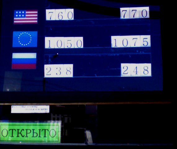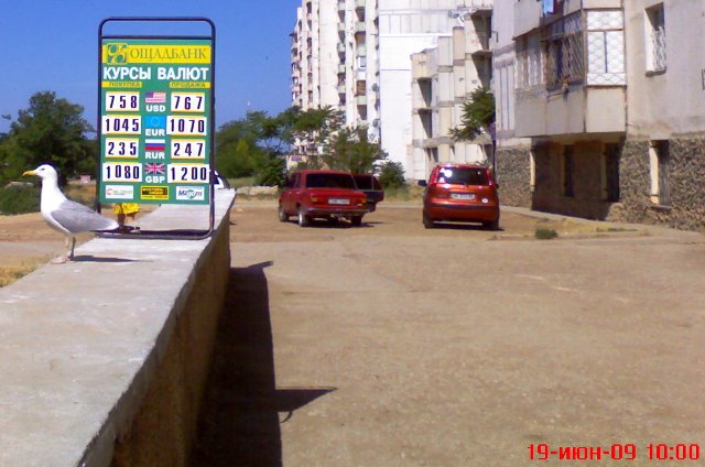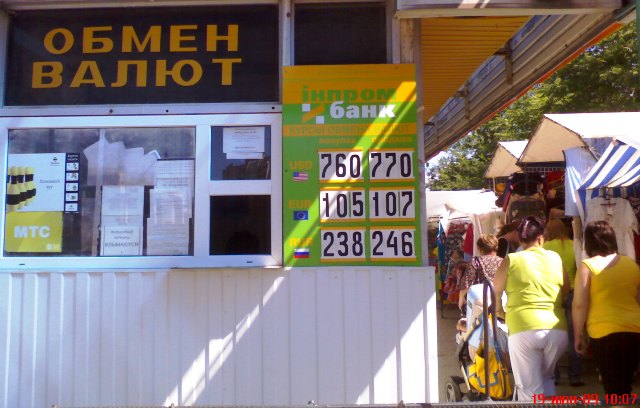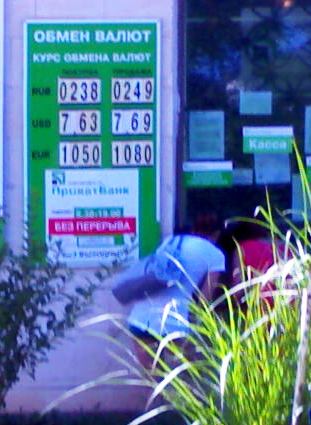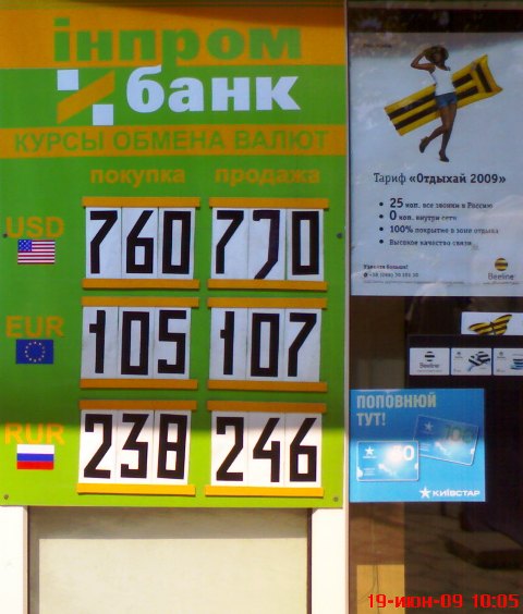 Поменять доллары США, евро, рубли России, гривны Украины в Крыму 19 июня 2009 года. Курс обмена валют в обменных пунктах Крыма. Крымский папарацци 19 июня 2009 года вместе с группой туристов из Москвы и Санкт-Петербурга провел фото мониторинг курса обмена наличной валюты в Евпатории. Сто долларов США туристы из Москвы поменяли на 760 гривен, и ушли на пляж. Более устойчивые к жаре туристы из Санкт-Петербурга те же сто долларов, прислушавшись к совету крымского папарацци, поменяли по более выгодному курсу в «Приватбанке» на 763 гривны. А вот туристы из Екатеринбурга так спешили, что обменяли свои сто баксов в «Ощадбанке» по самому невыгодному курсу - на 758 гривен. Кстати рубли России в этом «Ощадбанке» меняли также не очень выгодно. За тысячу рублей давали всего 235 гривен. Во всех остальных пунктах обмена валют, которые посетили туристы из России вместе с крымским папарацци, за тысячу рублей давали 238 гривен. На трояк больше. Мелочь, но приятно. «Крымский аналитик» продолжает напоминать потенциальным туристам из России о том, что в июне 2009 года в Крым выгоднее брать с собой рубли России, а не доллары, если вы, конечно, не получаете зарплату в баксах. П очему рубли везти выгоднее, чем доллары и насколько? Берите калькулятор и внимательно изучайте фото мониторинг курса обмена наличных валют «Крымского аналитика» не только за 19 июня, но и за все остальные июньские дни. И вам все станет ясно.