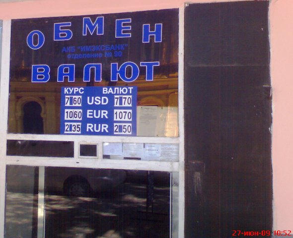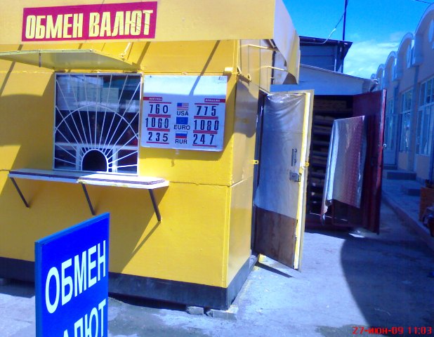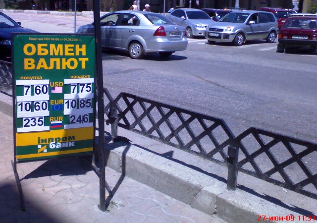 Курс обмена валютКурс обмена валют на 27, 28, 29 и 30 июня 2009 года. Украина. Крым. Евпатория. На Украине очередной праздник. Ближайшие три дня народ гуляет на пляжах, дачах и огородах. Гулять будет и Национальный банк Украины. В связи с массовым загулом народа  на Украине, в Киеве Национальный банк Украины установил следующий официальный курс гривны по отношению к основным иностранным валютам на 27, 28, 29  и 30 июня 2009 года.  100 долларов США до конца июня 2009 года равен 763.0300 гривна. 100 евро = 1075.5671 гривна. 10 рублей России = 2.4520 гривна.  А теперь, для тех, кто не понял: (Офіційний курс гривні щодо іноземних валют 30.06.2009.  Детальніше: 100 доларів США  = 763.0300. 100 евро =    1075.5671. 10  рублів Росії = 2.4520). «Крымский аналитик» в отличие от тех, кто уже гуляет и отмечает нечто эфемерное -  КОНСТИТУЦИЮ УКРАИНЫ,  продолжает работать в поте лица под жарким южным солнцем. Специально для туристов из Москвы, Санкт-Петербурга, Екатеринбурга, Курска, Новосибирска, Минска и Кемерово был проведен фото мониторинг курса обмена валют. Крымский папарацци 27 июня 2009 года в Евпатории установил следующее: 100 долларов США в пунктах обмена валют покупали у туристов из России и Беларуси по 760-764 гривны, а вот населению эту же сотню баксов в тех же пунктах обмена валют и филиалах коммерческих банков Крыма продавали  по 770 - 780 гривен. 1000 рублей  в пунктах обмена валют Евпатории меняли на 235 – 236 гривен. А продавали гражданам эту же тысячу рублей России по 246 – 250 гривен. Более подробно о курсе обмена валют в Крыму и Евпатории вы можете узнать, посмотрев  на прилагаемые фото.