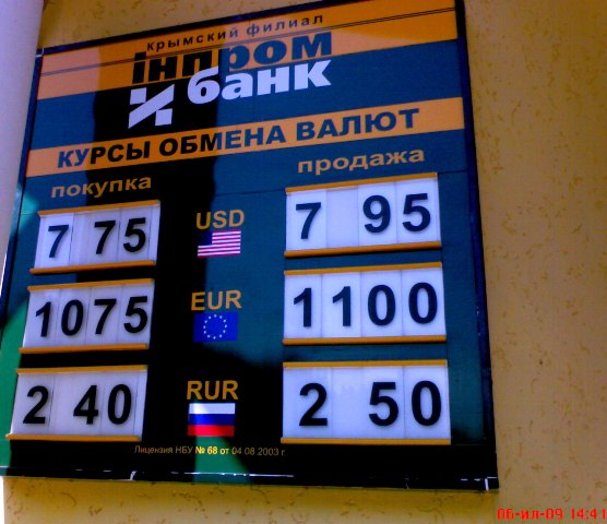 Курс обмена валютКурс обмена валют в Крыму 7 июля 2009 года. Фото. Мониторинг. Евпатория.