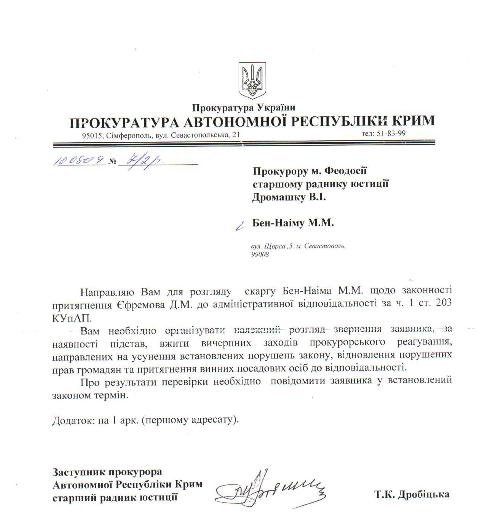 По факту незаконных действий сотрудников Феодосийской милиции, подтвержденных решением суда, правозащитник Марк Бен-Наим направил заявление с требованием привлечь виновных в нарушении закона милиционеров к ответственности и обязать их сдать экзамены на знание Конституции Украины и законов Украины.