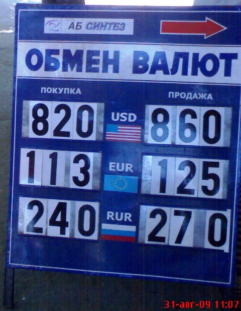 Курс обмена валютУкраина. Киев. Национальный банк Украины на 1 сентября 2009 года установил следующий официальный курс гривны по отношению к основным иностранным валютам. 100 долларов США = 798.9000 гривны. 100 евро = 1140.1901 гривны. 10 рублей России = 2.5091 гривны. (Офіційний курс гривні щодо іноземних валют 01.09.2009.     Детальніше: 100 доларів США = 798.9000. 100 євро = 140.1901. 10  російських рублів = 2.5091). «Крымский аналитик» 31 августа 2009 года провел расширенный фото мониторинг курса обмена валют в Крыму сразу в двух городах: в Симферополе и Евпатории. В последний день лета ситуация с обменом наличной валюты в Крыму не изменилась. По самому выгодному курсу для туристов доллары США и рубли России можно было обменять в центре Симферополя, а самый низкий курс обмена валют оказался, как всегда, на ЖД вокзале Симферополя. А теперь, о  курсе обмена валют в районе железнодорожных вокзалов Симферополя, Евпатории и на центральных улицах Симферополя, прилегающих к зданию  Верховного Совета Крыма.  В Евпатории 31 августа 2009 года в обменных пунктах валют на проспекте Победы и в районе Железнодорожного вокзала на улице Интернациональной  за 100 долларов США платили туристам из России и республики Беларусь 840 гривен, а 1000 рублей России меняли туристам на 250 гривен.