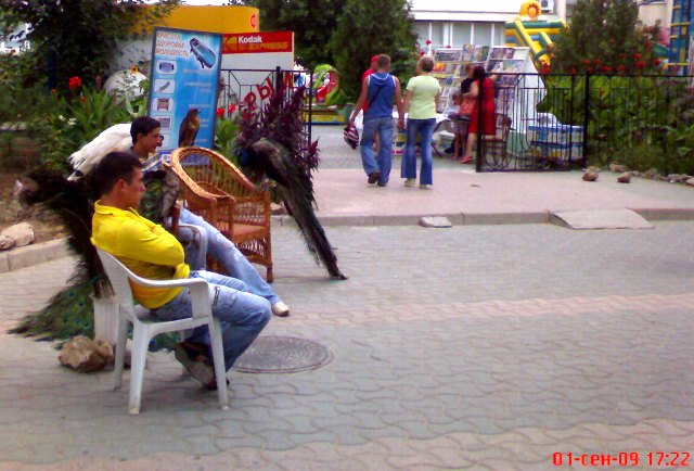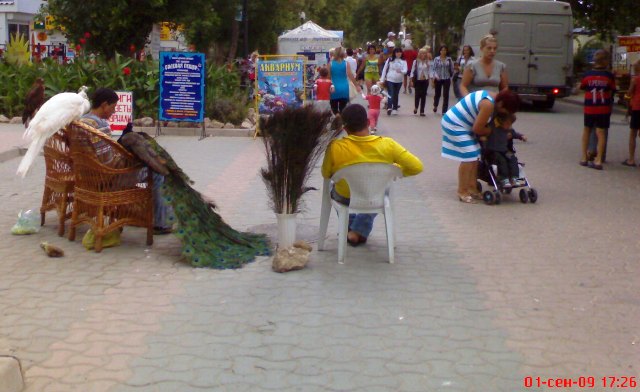 Фото. Крым. Евпатория. "Крымский аналитик" неоднократно писал о незаконном бизнесе фотографов - живодеров, которые для получения наживы используют диких животных. По пляжам и набережным курортных городов они таскают с собой в жару обезьян, удавов, попугаев, фотографируют с ними детей. А для того, чтобы дикие животные вели себя смирно, накачивают их различными лекарствами. Но это не спасает детей, которые фотографируются рядом с "ручными" обезьянками", от укусов и царапин. Каждое лето врачи регистрируют десятки нападений на курортников диких животных. Бизнес этот официально ЗАПРЕЩЕН СОВМИНОМ КРЫМА. Налоги живодеры-фотографы не платят, но несмотря на это, они спокойно стоят на набережных. Одна из таких бригад-живодеров с дикими птицами все лето проработала на глазах местной милиции и многочисленных проверяющих на набережной имени Горького у евпаторийской водолечебницы. Говорят, что они трудятся под "милицейской крышей", отдавая ежедневную дань местным "оборотням в погонах". К этому выводу подталкивают и ответы на письма правозащитников, подписанные лично начальником Евпаторийского горотдела милиции Камалом Абдулаевым. "Крымский аналитик" публикует сегодня очередную отписку Камала Абдулаева на официальное обращение правозащитников в которой тот утверждает, что "незаконная деятельность по использованию декоративных птиц в коммерческих целях пресечена, новых фактов данного вида нарушений не выявлено". Получив это письмо, крымский папарацци 1 сентября 2009 года запечатлел на набережной имени Горького все тех же "живодеров фотографов", которых в упор не видит начальник евпаторийской милиции Камал Абдуллаев. В связи с незаконными действиями сотрудников милиции "Крымский аналитик" обращается к начальнику Крымского главка милиции Геннадию Москалю с вопросом: как он лично относится к издевательству над ни в чем не повинными птицами и животными? Нам бы также хотелось узнать у уважаемого генерала, как долго он будет терпеть "оборотней в погонах" в своем ведомстве?